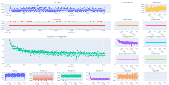Každý panel dashboardu (ze kterého vidíte jen kousek) ukazuje průběh jednoho z procesních parametrů, které jsou podstatné pro kvalitu výlisku. V grafu lze přepínat mezi různými lisy, měnit časové okno zobrazení, filtrovat, zvětšovat a zmenšovat rozsah os a tak dále. Chvíli trvá, než se technologové, údržbáři a seřizovači začnou na data dívat a na různé formy vizualizace si zvyknou. Potom ale začneme slyšet přesně ty rozhovory, na které se na platformě vždycky těšíme: